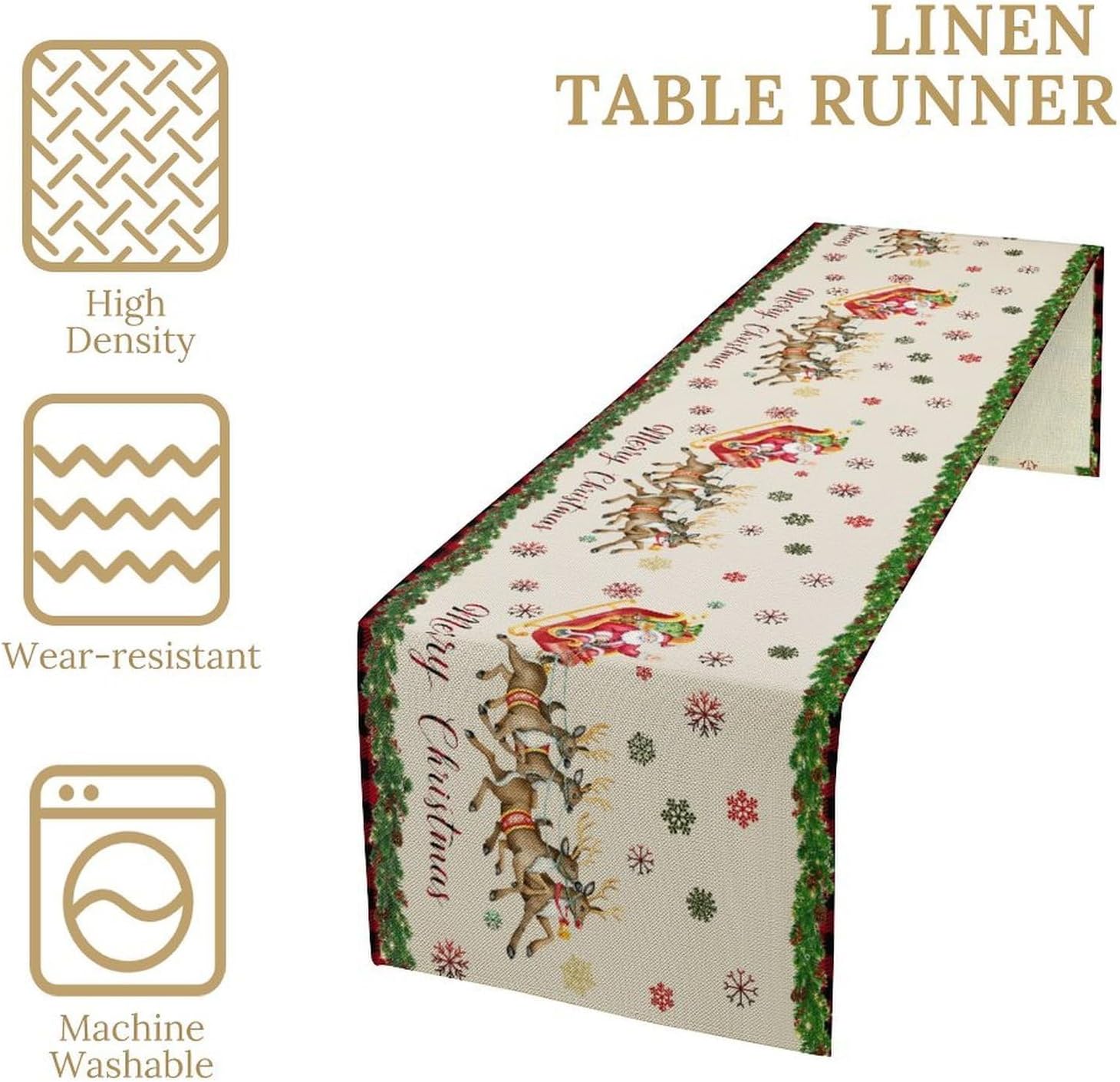 Christmas Table Runner,Xmas Deer Cute Santa Claus Red Plaid Pattern Printed Tablecloth Burlap for Hotel Indoors Outdoor Dining Room Kitchen Home Decor,W13X L108 in