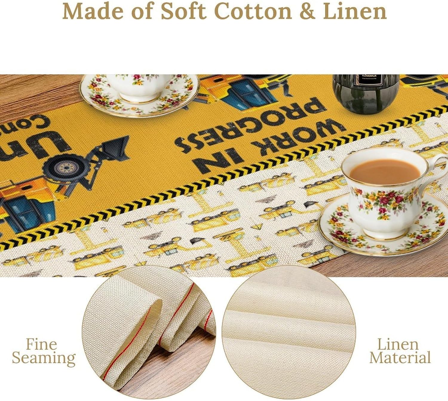 Cartoon Car Table Runner,Boys Kids Construction Vehicles Truck Yellow Print Tablecloth Burlap for Hotel Indoors Outdoor Dining Room Kitchen Home Decor,W13X L80 in