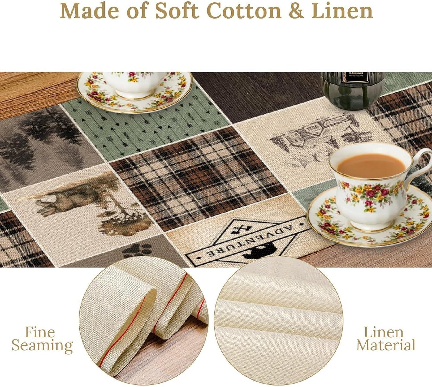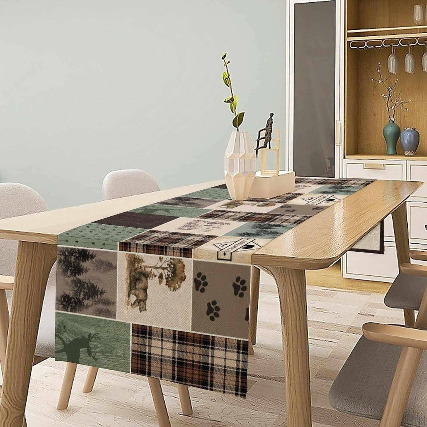 Bear Deer Table Runner,Rustic Lodge Retro Country Farmhouse Buffalo Plaid Print Tablecloth Burlap for Hotel Indoors Outdoor Dining Room Kitchen Home Decor,W13X L108 in