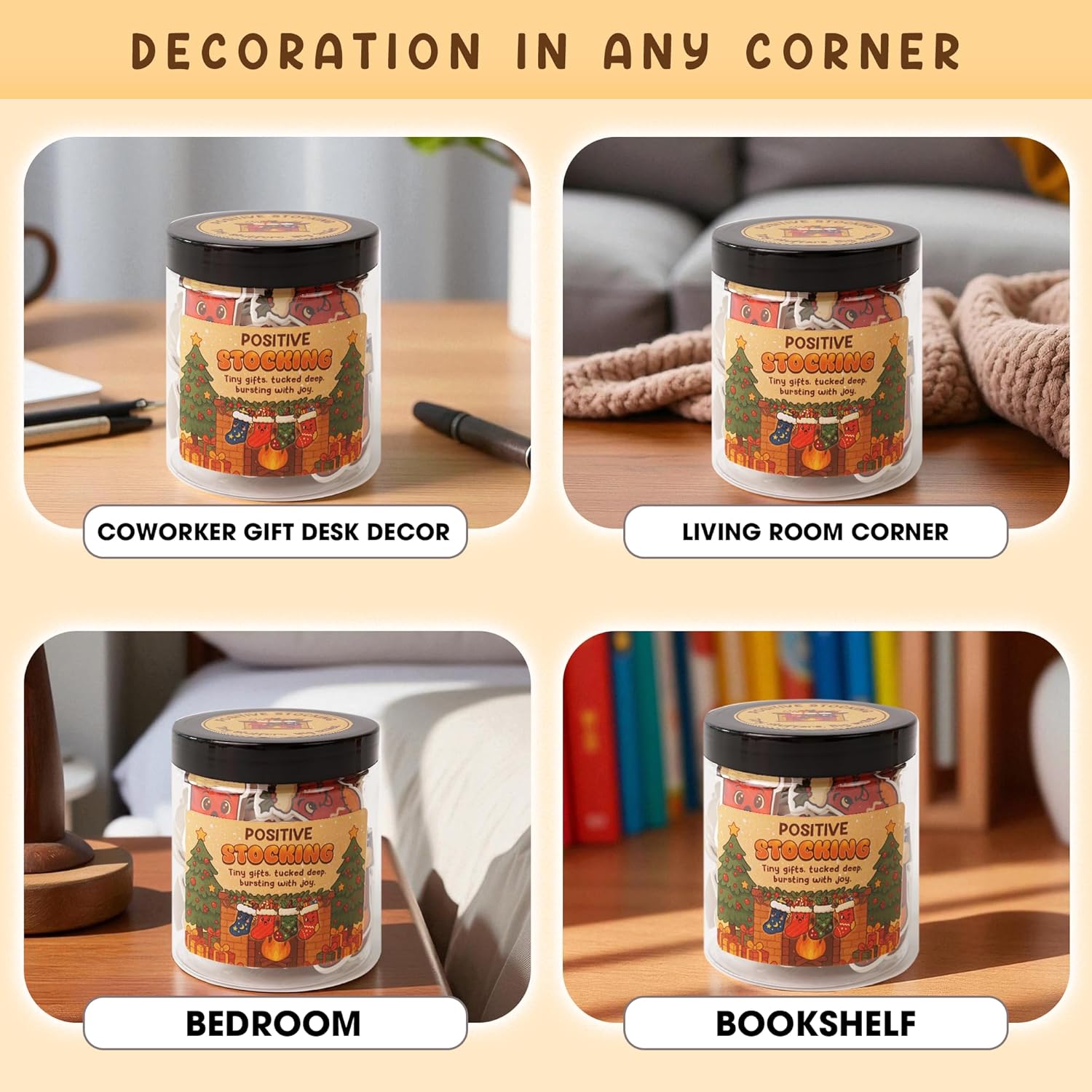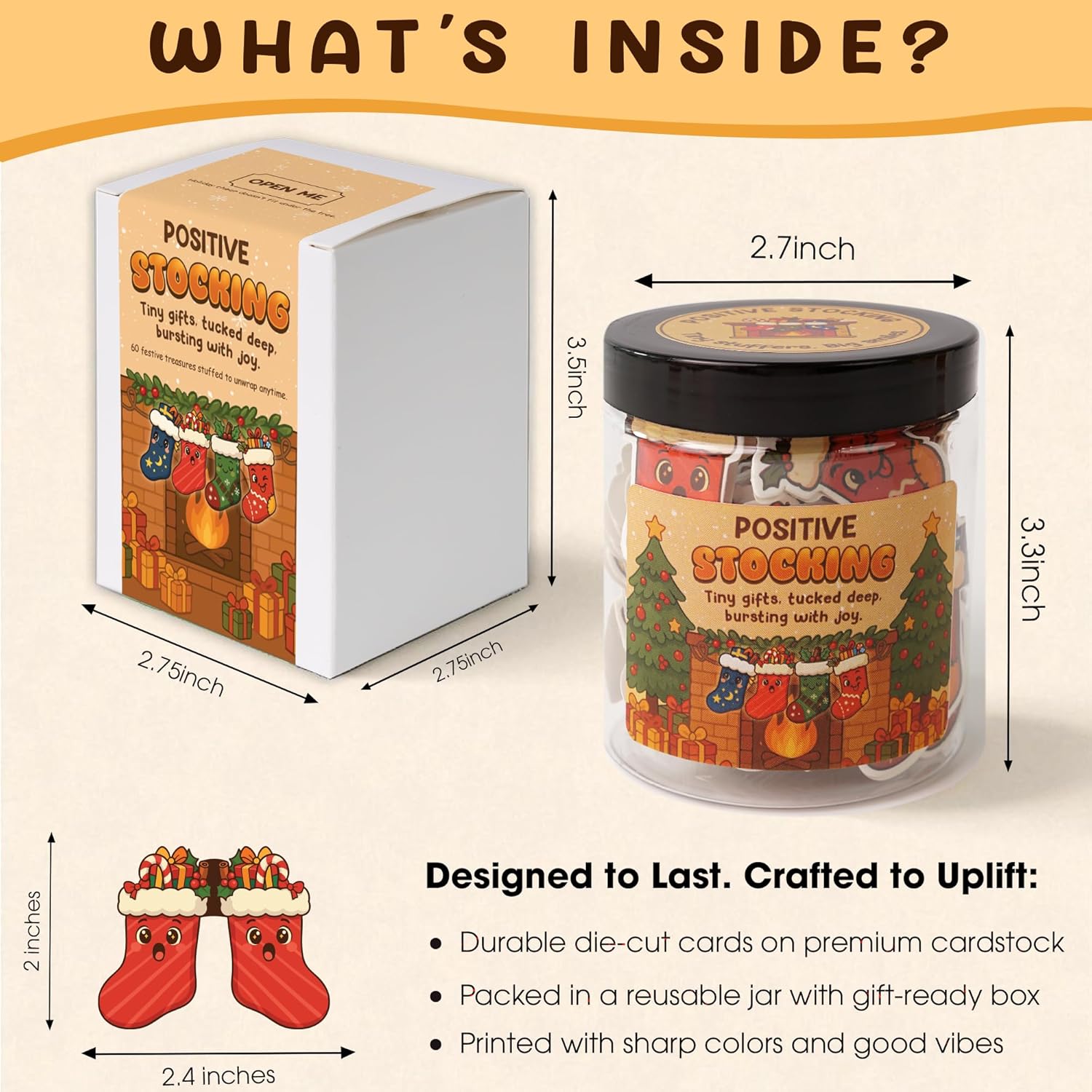 - 🎁 The Ultimate Feel-Good Gift This Positive Stocking Jar is packed with 60 cheerful notes to boost joy, ease stress & bring laughs—perfect christmas gifts for teens and women who need a holiday pick-me-up. Whether you’re looking for stocking stuffers for teen girls or stocking stuffers for women, this positive Stocking jar will brighten anyone’s day.