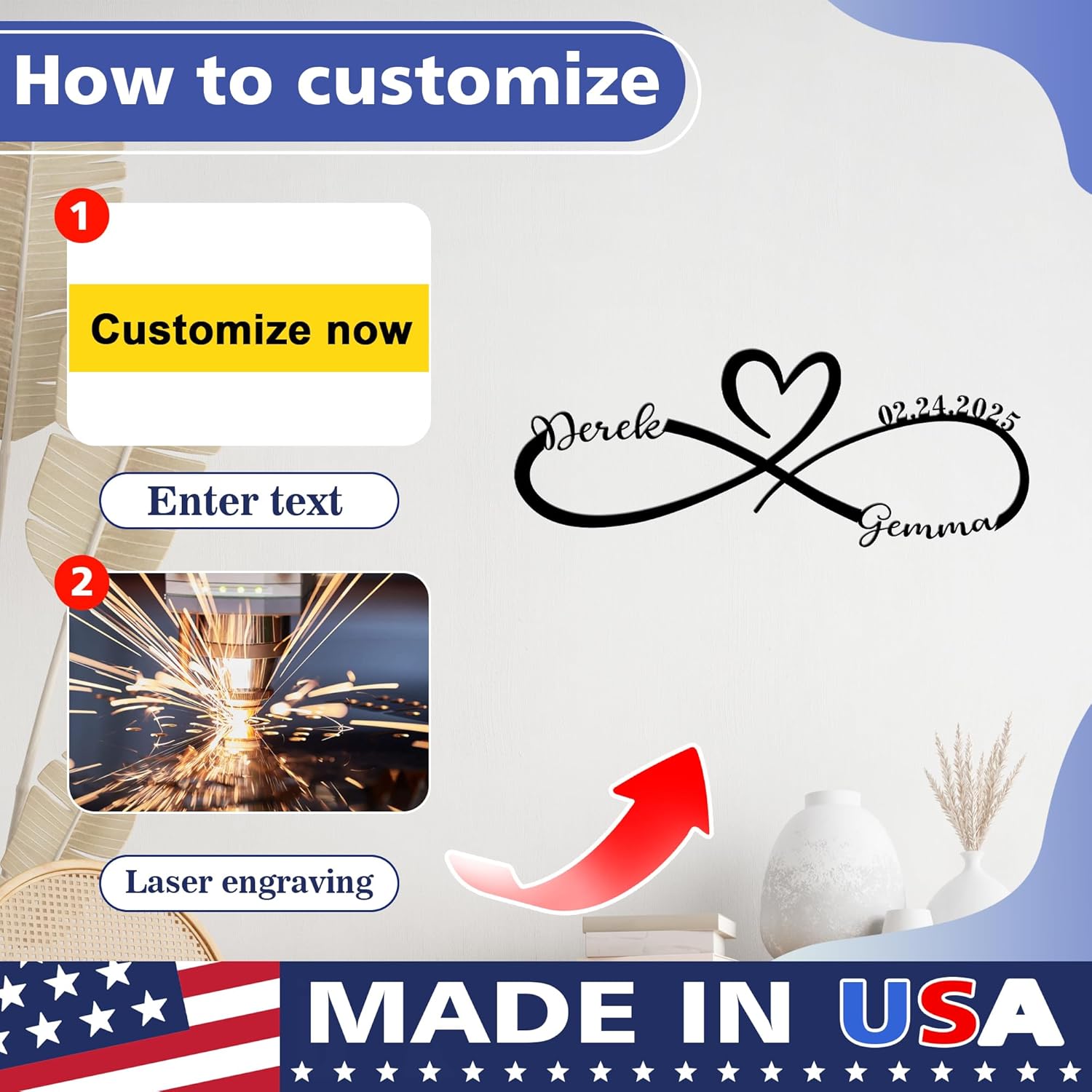 - CUSTOM MONOGRAM METAL SIGNS: Our metal signs are made in the USA, ship quickly. We offer a variety of designs and sizes to choose from. You can customize your name, last name, and anniversary date as a home decor sign, living room wall decor sign, or wedding sign. It is not only the perfect home decoration, but also an excellent way to showcase beautiful memories.